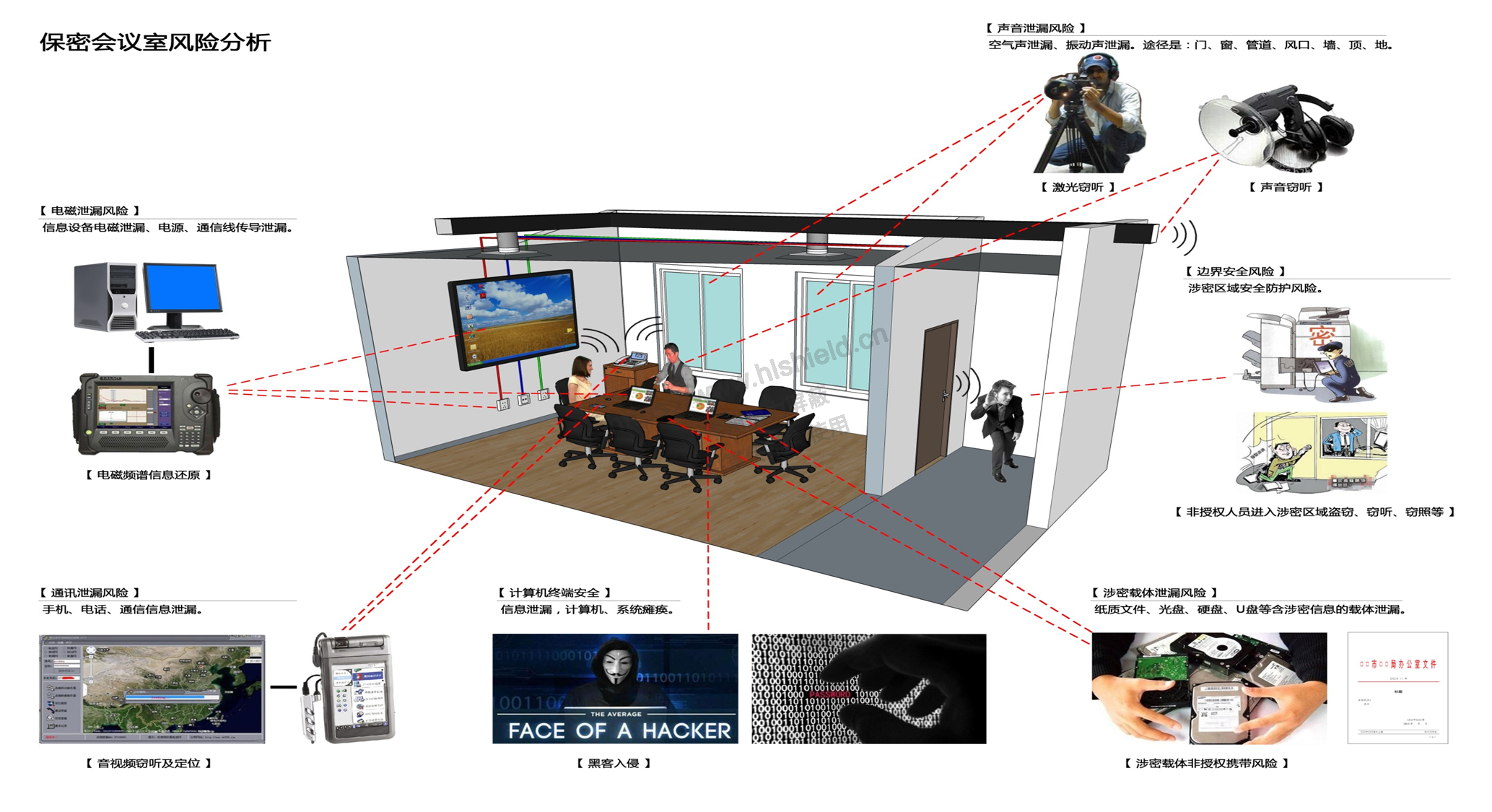 目前,隨著黨政機關(guān)、科研機構(gòu)、國防軍工和國有企業(yè)等單位的工作會議、技術(shù)交流、項目匯報、科研講座的增多,對現(xiàn)代視訊展示、數(shù)碼電聲處理、自動化電器處理等組成的多媒體聲、光、像會議系統(tǒng)和保密防護技術(shù)的需求越來越強烈。我們根據(jù)其實際應(yīng)用和需求,依據(jù)國家保密標準BMB26-2012《保密會議室保密要求和測試方法》的規(guī)定,結(jié)合會議涉及的涉密信息等級,對重要區(qū)域采取先進的防護技術(shù)手段,我公司推出了保密會議室等重要區(qū)域的整體解決方案及系列專用產(chǎn)品,在功能和性能方面完全滿足各級保密部門不同密級的防護需求。